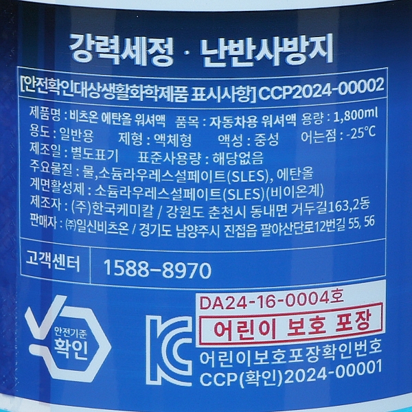 *제품특징 - ISO 9001, 14001, 45001 인증 - 금속, 고무, 플라스틱, 도막안전확인 - 유리창의 기름때, 먼지, 얼룩, 타르, 염분, 벌레등 제거에 효과적 - 유막제거&난반사방지 - 어는점 영하 25도 - 어린이 보호용 캡 적용 상품 *제품용도 - 자동차용 *주의사항 - 용도외에 사용하지 마십시오 - 어린이의 손이 닿지 않는 곳에 보관하십시오 - 눈에 들어간 경우 물로 씻고 이상이 있을 시 의사와 상의하십시오 - 화기를 가까이 하지말고 마시거나 흡입하지 마십시오 - 워셔액 분사 후 차량의 유리창을 열어 1~2분간 환기시켜주세요 - 반드시 세워진 상태로 운반, 유지해야 누액으로 인한 피해를 방지할 수 있습니다